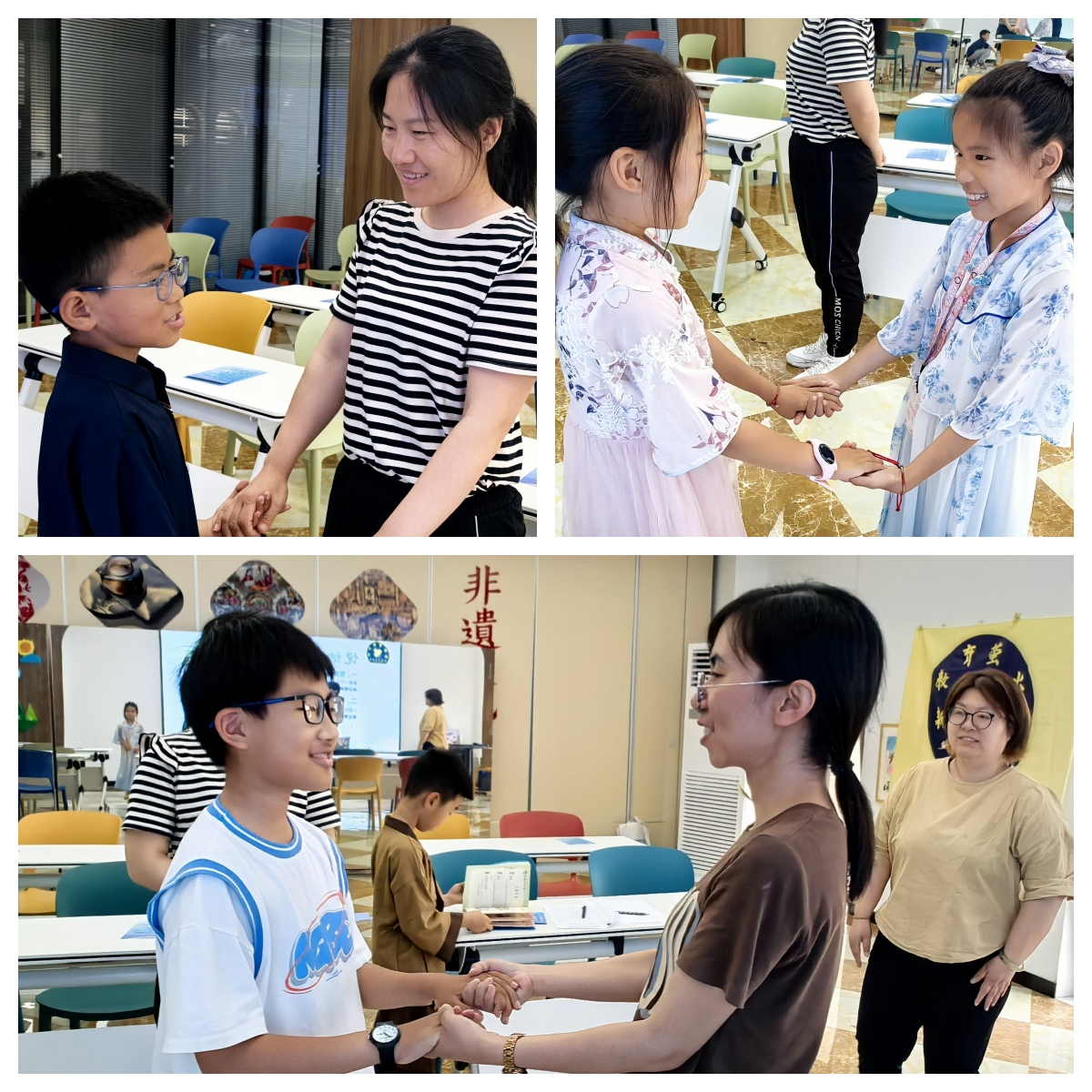 活动的最后,齐老师教给同学们一个好工具——悦纳,大家一起手拉手围成一个圆圈。齐老师首先对王丽丽进行了悦纳,拉起了她的手,看着对方的眼睛,对她说出:在我心里你是一个这样的人……,我记得在……时间里,你做过这样一件事让我印象深刻……,最后王丽丽进行了回应。接着我们从姜博闻同学依次开始悦纳。我们之间有好朋友、有同学、有母子、有邻居、有兄妹……此刻,在这间小小的教室里,我们互相真诚的表达自己的爱,一片欢声笑语,爱的暖流在教室里流淌。最后以一首好听的歌曲《你笑起来真好看》结束了本次活动。
