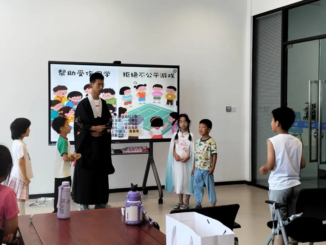 在参与育菁情境国学教育实践队活动中,我遇到了可爱的孩子们,短短几天,起初站在讲台上,面对十几双眼睛难免忐忑,词句在嘴边打转。可清澈眼眸里映出的好奇与喜悦是最好的鼓励,我渐渐学会将《论语》的深邃化为生动故事,将诗词的韵律编织成可触摸的想象。这份孩子们纯真的感情与表达能力的蜕变,是这次实践活动赠予我最珍贵的礼物。当童声齐诵时,整个夏天都浸染在文化传承的温柔光芒里。愿在炎炎夏日,稚嫩心灵与古老智慧相遇,彼此点亮。