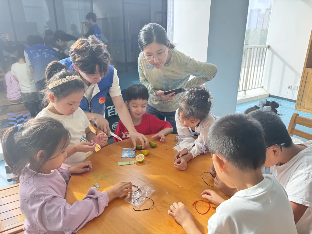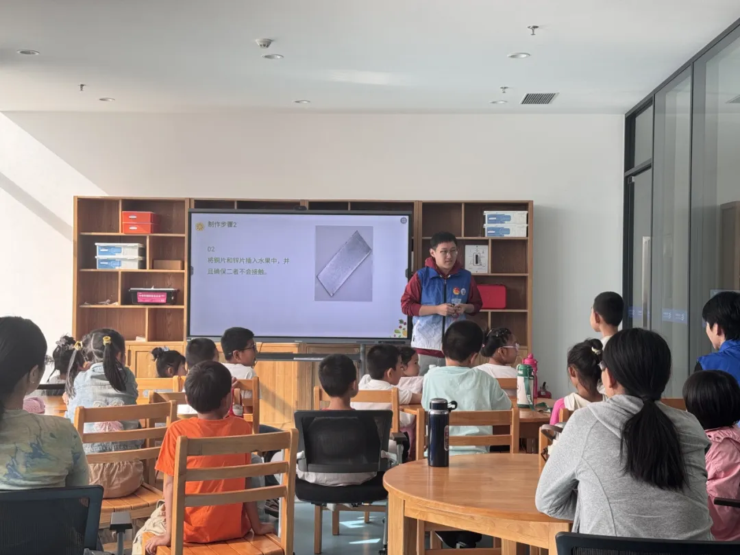 进入动手实践环节,小读者们以小组为单位协作,迫不及待地尝试制作属于自己的水果电池。志愿者们穿梭在各小组之间,耐心指导每一个操作步骤,及时解答小朋友提出的各种疑问。