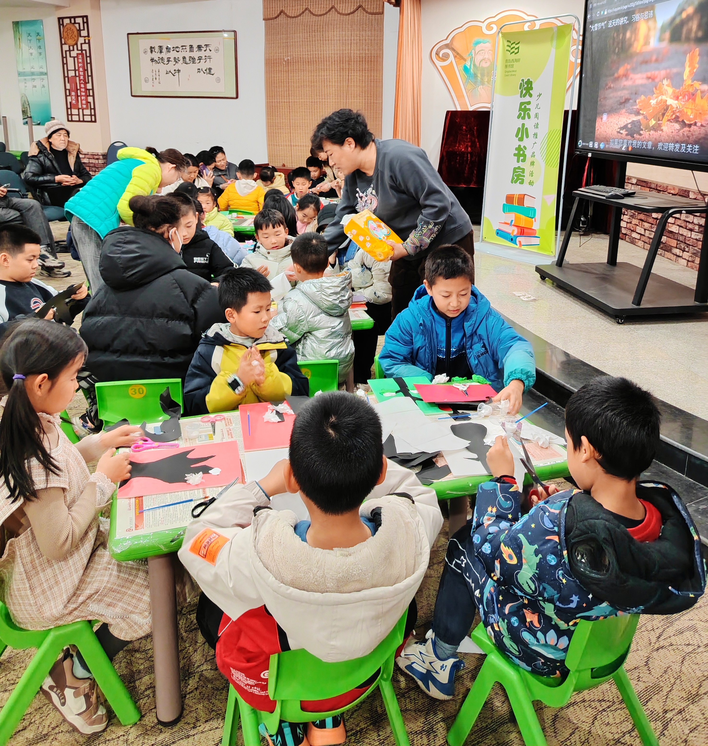 12月6日,青岛西海岸图书馆珠江路馆举办了“雪落指尖•阅享冬趣”——“快乐小书房”大雪节气主题活动。本次活动以“节气科普+手工实践”为核心,吸引20组亲子家庭参与,在趣味互动中传递节气知识与民俗文化。