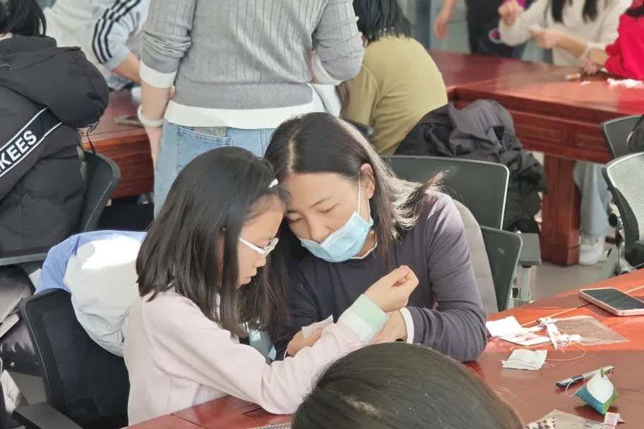 孩子们细心地为雪宝缝上胸针,当这枚独一无二的“勋章”被点亮,一件可佩戴的专属作品便宣告完成。看着手中共同完成的雪宝,家长和孩子的脸上都露出了满足的笑容。