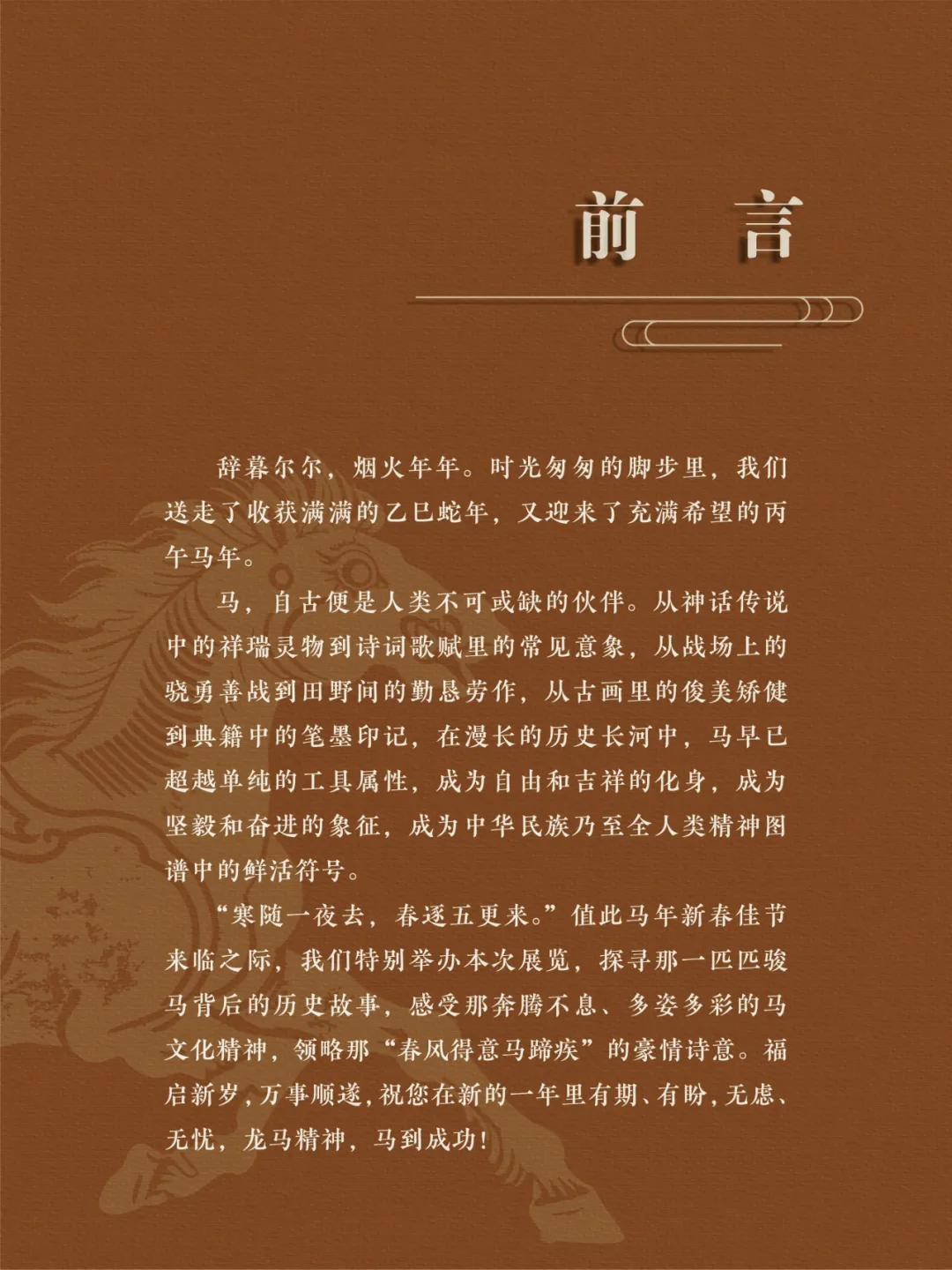 今日为读者朋友们带来“春风得意马蹄疾——丙午新春年俗及马文化展”。展览分为“驭风韵俗”“竣功昭世”“文典寻骢”“骐骝骅骥”四大单元,诚邀广大读者线上“云观展”。让我们一同探寻骏马背后的历史故事,感受奔腾不息、丰富多彩的马文化魅力!