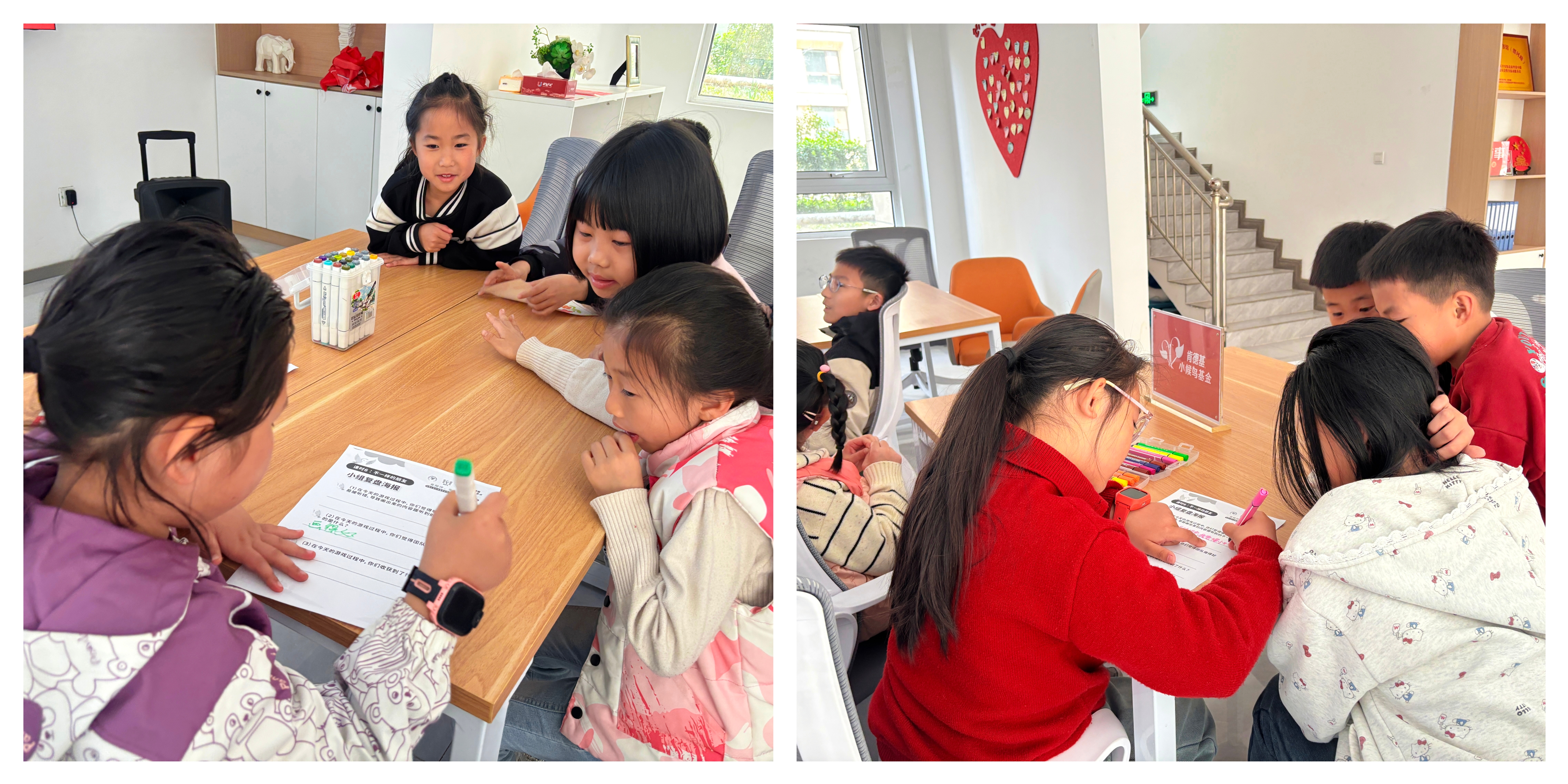 活动最后,志愿者老师带领孩子们一起借助小组复盘海报,共同回顾整场活动的精彩瞬间。大家踊跃发言,分享自己最喜欢的游戏环节、绘本里印象最深的情节,诉说在活动中认识的新朋友、学到的小道理,把活动中的快乐、感悟与收获一一记录在海报上。
