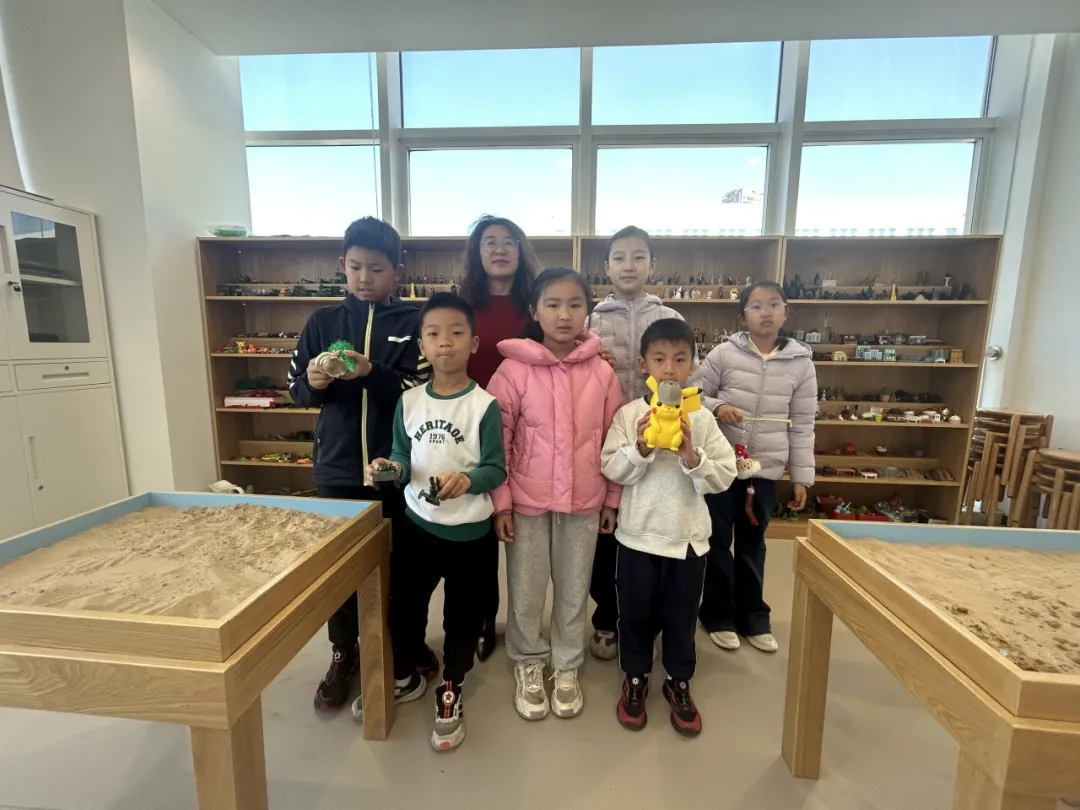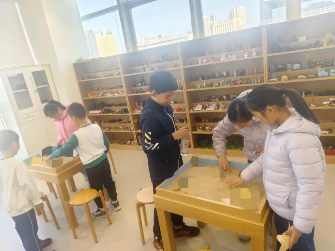 在沙盘搭建环节,孩子们专注挑选沙具、轻拨细沙,充分发挥想象力与创造力,在方寸沙盘中共同构筑属于自己的“小世界”。从场景布局到沙具摆放,孩子们在无声的协作中学会沟通、理解与包容,将内心的想法、情绪与愿景具象化呈现。李玉凤老师全程耐心陪伴、适时引导,关注每一位孩子的表现,鼓励大家大胆表达、积极参与。