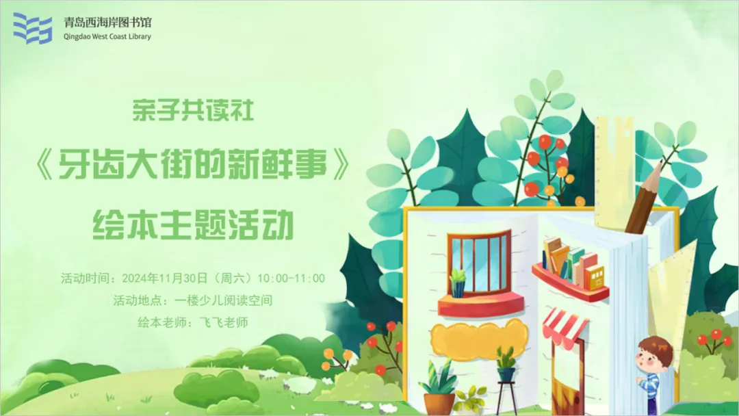 11月30日(本周六),青岛西海岸图书馆邀请高级家庭教育指导师飞飞老师,开展《牙齿大街的新鲜事》绘本主题活动。