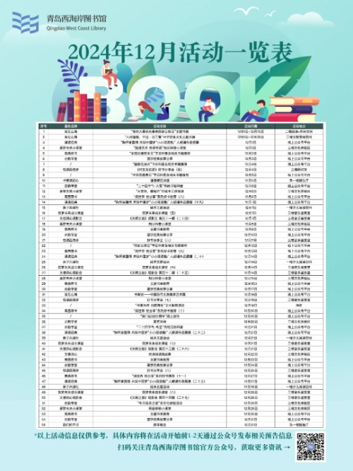 感谢大家对青岛西海岸图书馆的支持与关注,我们期待您的参与,让这些活动因您的加入而更加精彩。愿您在12月的活动中度过愉快的时光,收获满满的知识和感动。