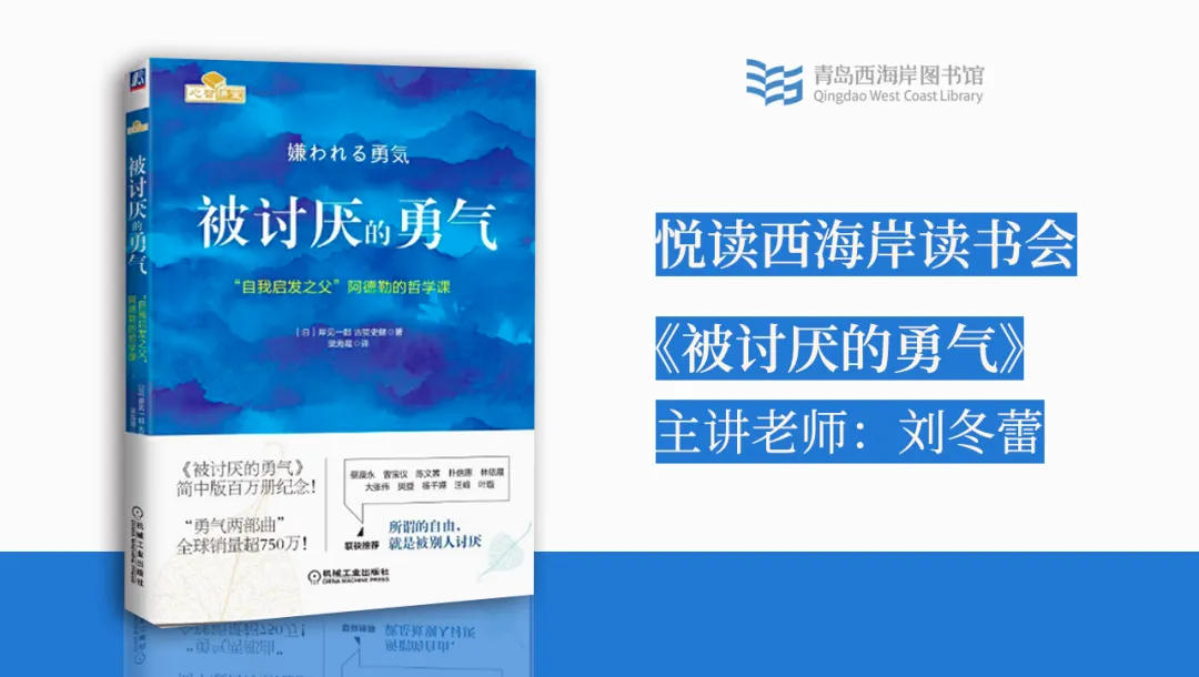 1月15日,青岛西海岸图书馆诚挚邀约各位读者朋友,再次相聚于“悦读西海岸”读书分享会,本周,我们将与家庭教育指导师、高级心理咨询师刘冬蕾共读《被讨厌的勇气》。