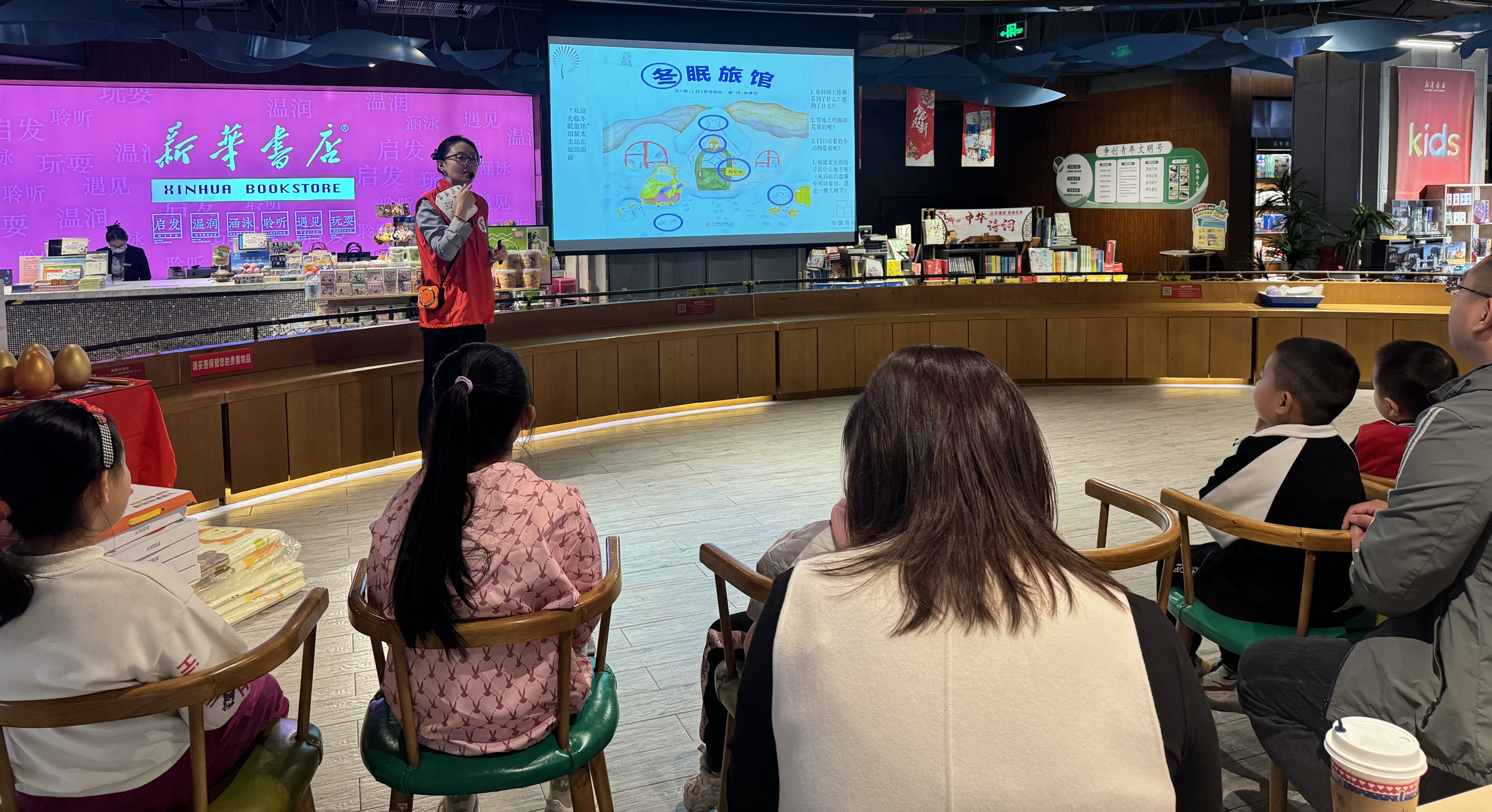 2024年11月9日上午,青岛西海岸图书馆联合黄岛新华书店传媒书城举办了绘本故事会活动,本期的绘本故事是《冬眠旅馆》。