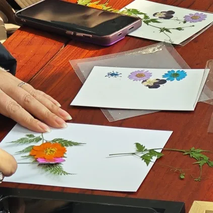 读者们边学边做,尹老师耐心地指导构图技巧——押花的精髓在于“以花作笔”,既要保留自然本真,又要注入个人巧思。大家聚精会神,全身心地投入,尽情地享受着押花艺术的魅力。