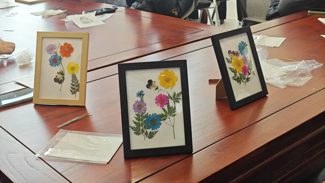通过材料选择、整理清洁、压制干燥等,一朵朵普通的花在指尖流转间变成了一幅幅独一无二的押花作品。这些作品将传统押花技艺的精髓融入现代生活,展现着非遗文化的深厚底蕴和独特魅力。