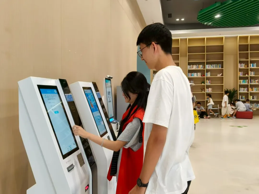 志愿服务期间,“红马甲”的身影活跃在图书馆的各个角落。在少儿借阅空间,他们协助小读者借还图书,耐心指导孩子们使用自助借阅设备,稚嫩的道谢声与轻快的操作提示音交织成温馨的旋律;到了多媒体体验空间,遇到年长或对设备陌生的读者,志愿者们总会放慢语速,手把手地一步步讲解,从系统操作到资源检索,直到对方能熟练使用才放心离开。