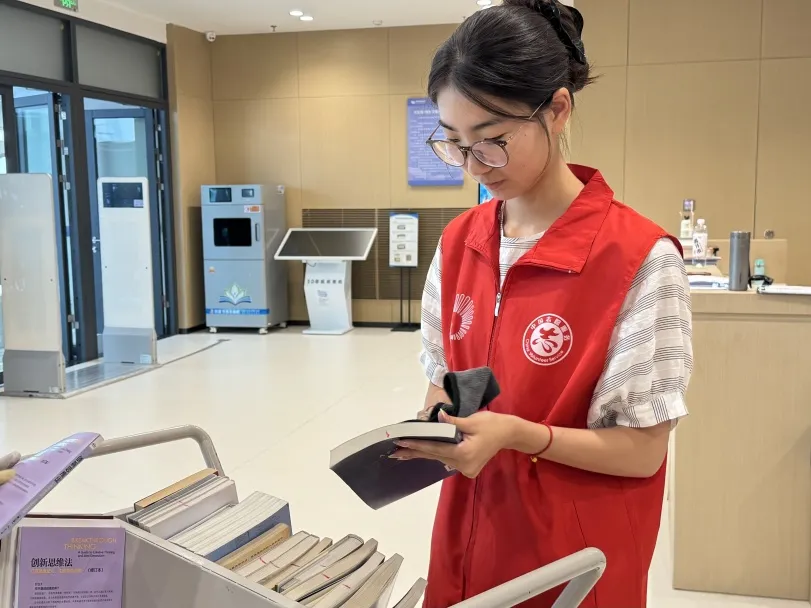 书架整理是志愿者们每日的“必修课”。他们熟稔地运用培训所学的分类知识,将一本本归还的图书精准归位到对应的位置。