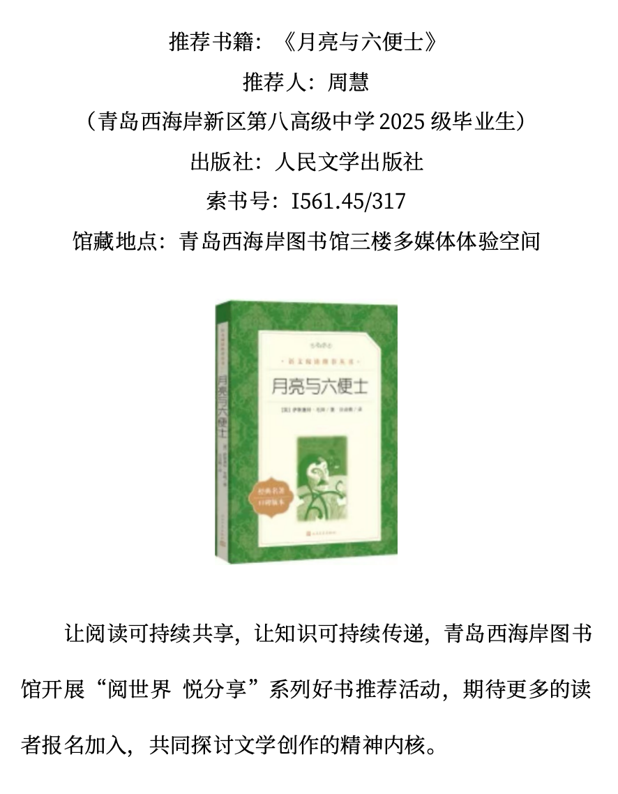 青西荐书| 《月亮与六便士》——“阅世界 悦分享”系列好书推荐(四十三)