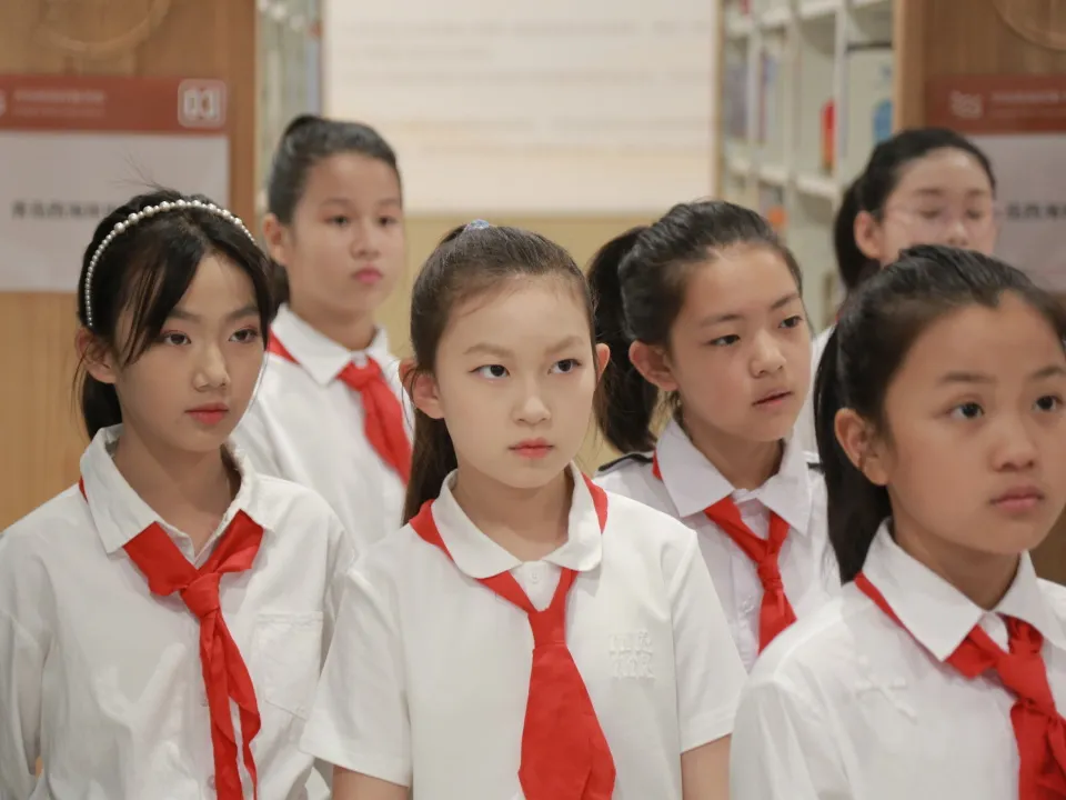 一本本厚重的史书轻轻被翻开,一双双稚嫩的眼睛闪烁着求知的光芒,红领巾的鲜艳与书籍的墨香交织,映照出新时代少年的精神风貌。