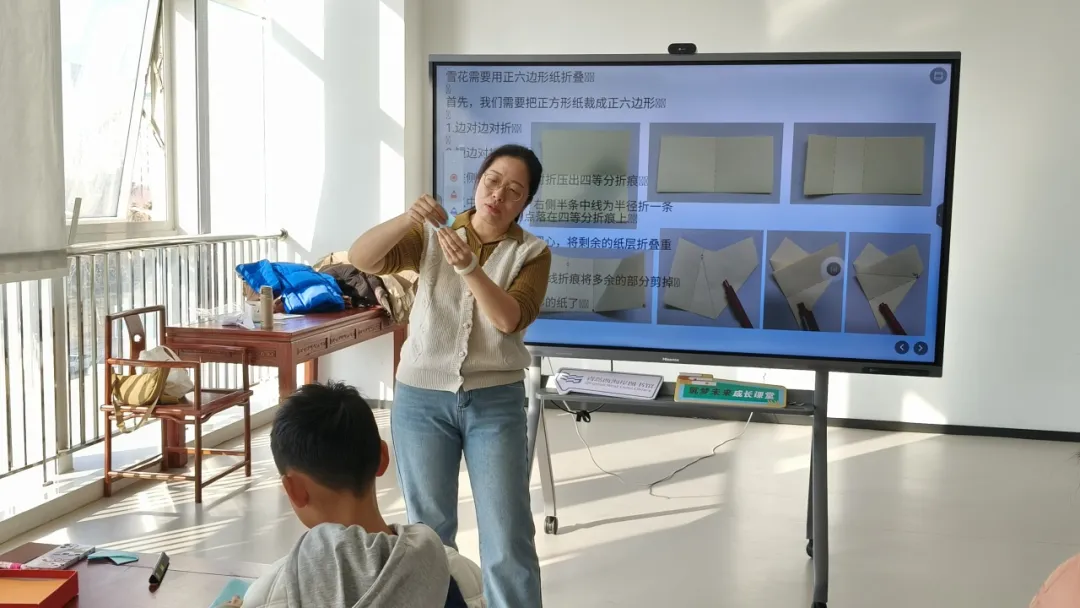折叠完成后,大家纷纷展示自己的作品。有的雪花棱角分明,有的柔和优雅,每一片都承载着折叠者的心意。许老师鼓励大家将雪花制作成书签、挂饰,甚至组合成装饰画,让这份手作的温暖延续到日常生活中。