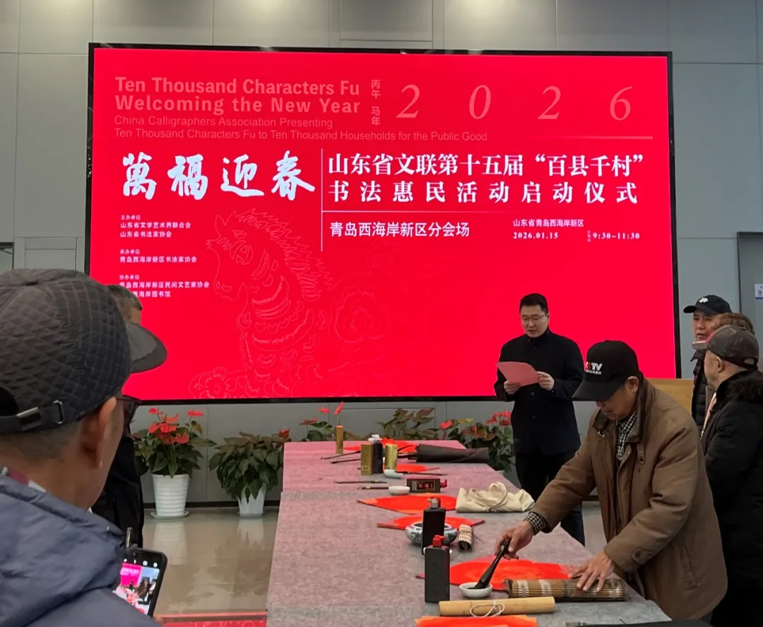 1月15日上午,“万福迎春——山东省文联新时代文明实践第十五届‘百县千村’书法惠民活动(青岛西海岸新区分会场)启动仪式”在青岛西海岸图书馆一楼大厅成功举办。