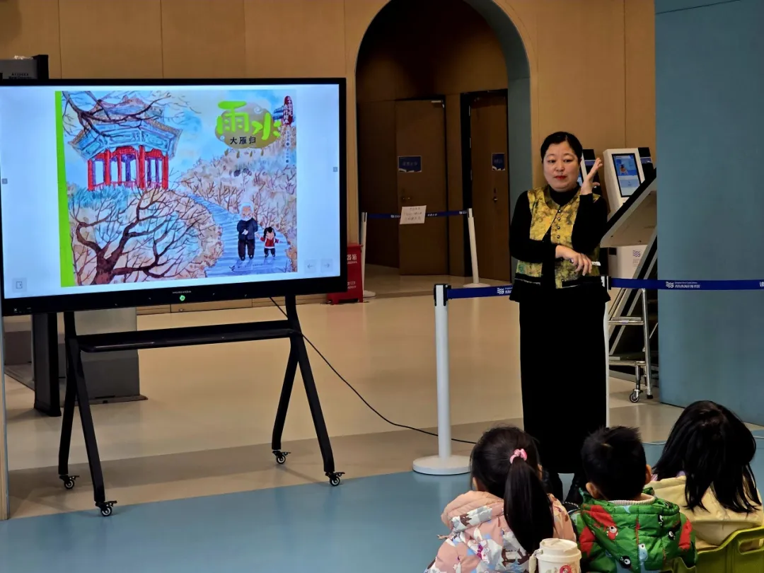 活动开始,张老师用生动温柔的语气为小读者们讲述《雨水・大雁归》的故事,一边讲述,一边引导大家观察画面细节。小读者们踊跃举手、分享发现,在故事中直观感受雨水节气的特征,体会自然与季节的奇妙关联。