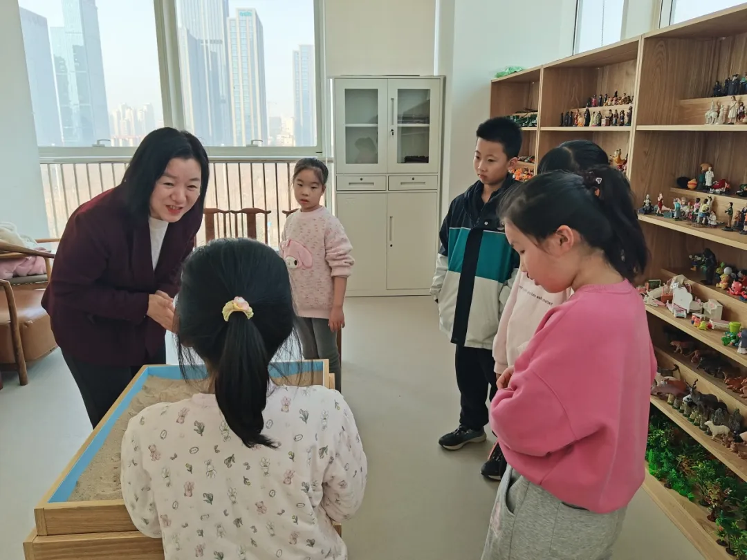 活动伊始,熠柔老师通过趣味互动游戏快速拉近孩子们的距离,现场笑声不断,为后续团体创作奠定了良好基础。随后,熠柔老师详细讲解了沙盘游戏的规则与意义,鼓励大家大胆发挥想象、自由表达内心。接下来,孩子们自由挑选心仪沙具,动手搭建专属沙盘场景,创作过程中,熠柔老师在旁适时给予指导,帮助孩子们梳理思路、完善创意。