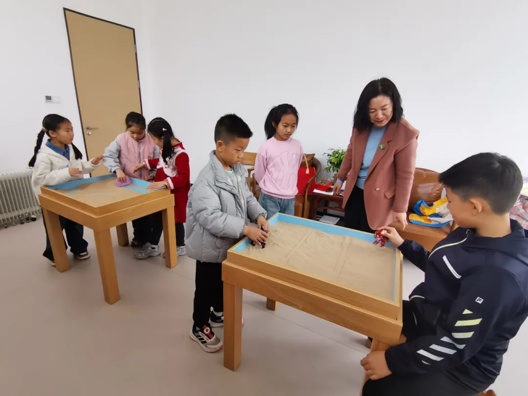 随后,熠柔老师讲解规则,孩子们自由分组,开启创意时光。沙盘前,有的孩子弯腰仔细挑选心仪的沙具,有的轻轻拨动细沙,有的认真思考摆放位置,那份专注让人深深动容。这便是沙盘的魔力,它让内心世界通过具象的沙具清晰地呈现出来。