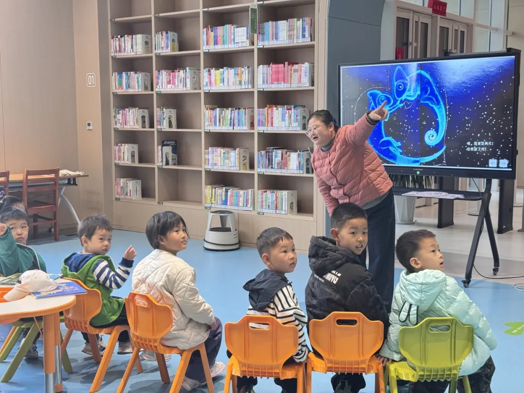 活动伊始,张冬梅老师以春天的色彩为引,通过生动的提问和趣味描述,向小读者们介绍了春日里万物斑斓的景象,引出了藏在色彩里的“调皮变色龙”,孩子们睁大眼睛好奇聆听,对即将开启的绘本世界充满期待,现场氛围瞬间被点燃。