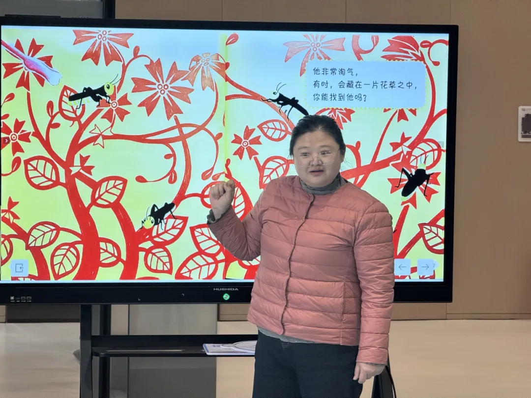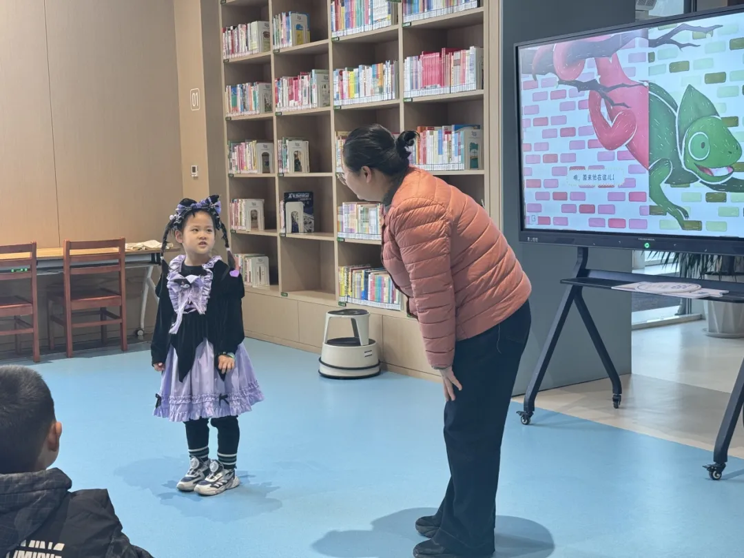 在《变色龙你在哪儿》的共读环节,大家跟着绘本画面,一同寻找那只擅长变色的小家伙,从嫩绿的草叶到缤纷的花丛,小读者们睁大眼睛仔细观察,在一次次寻找中感受色彩的奇妙变化,锻炼着观察力与专注力,仿佛真的置身春日大自然,和变色龙玩起了趣味捉迷藏。