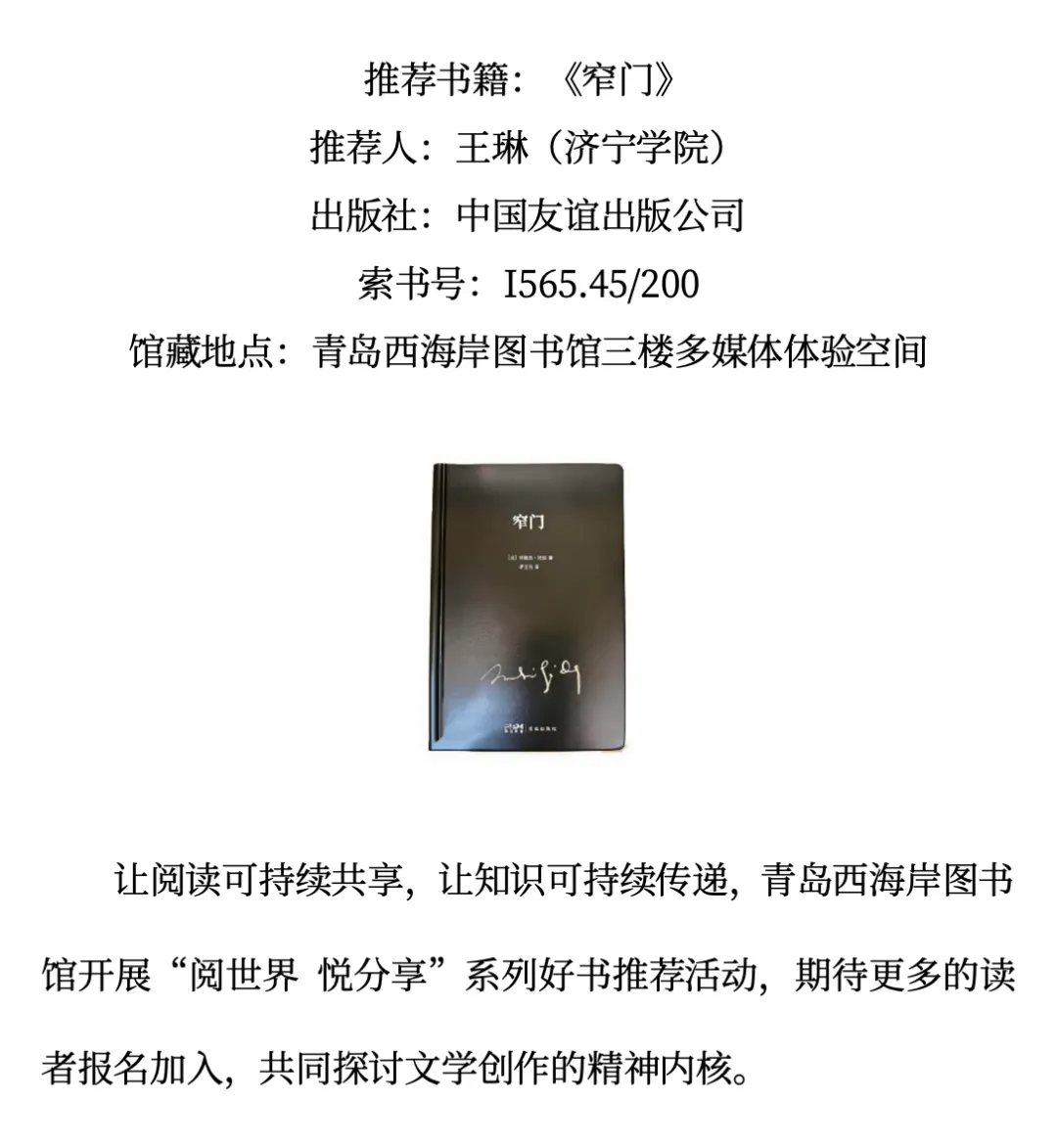 青西荐书|《窄门》——“阅世界 悦分享”系列好书推荐(七十九)
