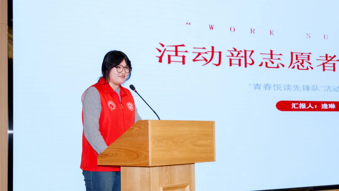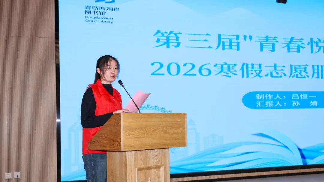图书馆第三届“青春悦读先锋队”对2026寒假志愿服务活动进行了全面回顾。志愿服务部部长孙婧、活动服务部部长逄琳分别代表团队做总结发言。