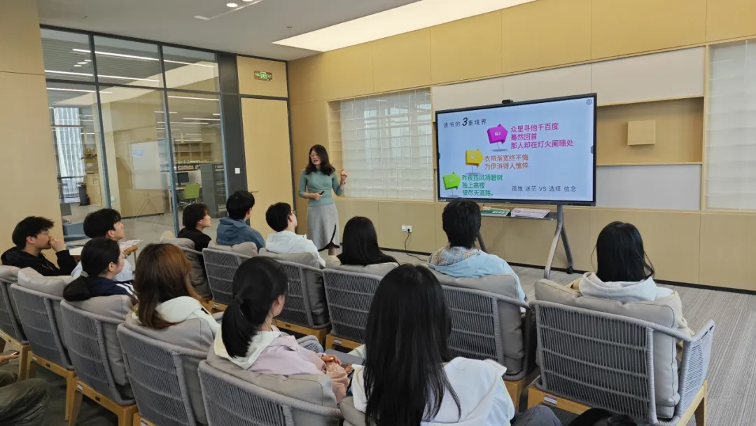 海英老师以“书单分享”破冰,与同学们交流近期阅读感悟,并坦诚分享了她的教研用书《第二曲线》《百岁人生》《中年觉醒》,创作参考书《走出黑森林》及个人成长读物《越过山丘》等书单,迅速拉近彼此距离。