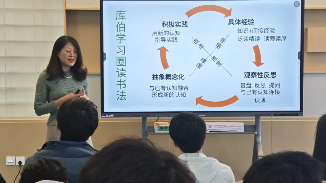 围绕“为何读-如何读-读什么”的核心命题,海英老师结合自身数十年的阅读进阶历程,生动诠释了终身学习的价值。当谈及阅读方法论时,她为读者们分享了“库伯学习圈”四阶模型:从具体经验(实践感知)到观察性反思(归纳规律),经抽象概念化(理论提炼)至积极实践(验证迭代),构建螺旋上升的认知闭环。