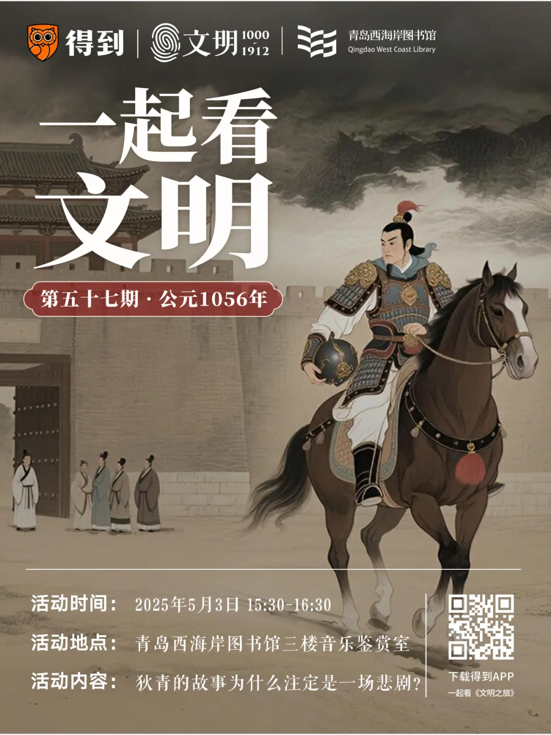 5月3日(本周六),青岛西海岸图书馆诚邀您参加《文明之旅》观影会,“穿越”到公元1056年。这一年,大宋因为水灾把年号改成了“嘉祐”,欧阳修和几个大臣一齐要求朝廷罢免狄青,说这样老天爷就不下雨了。宋仁宗只好罢了狄青的枢密使,安排到陈州当知州。半年后,狄青在陈州忧惧而死。