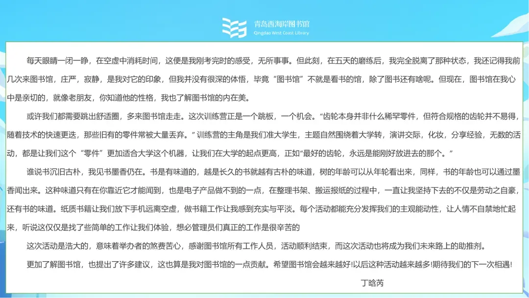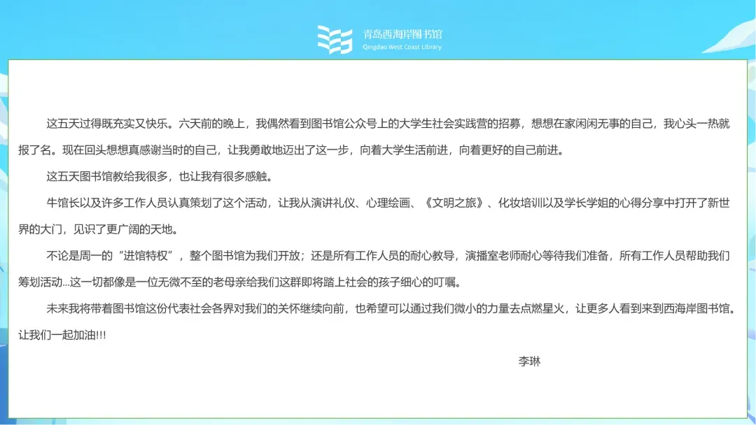 结营仪式上,青岛西海岸图书馆还将颁发社会实践证书,为成长营画上圆满句号。
